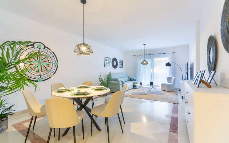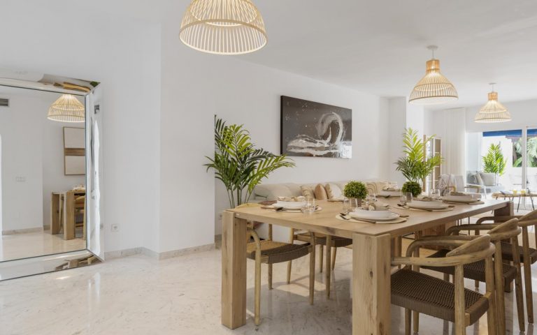 Gran apartamento de 3 dormitorios ubicado en uno de los complejos más deseados en la playa de Puerto Banús, amueblado por Muebles Gavira Casares Costa con estilo natural mediterráneo y ofrecido para alquiler vacacional por www.banusrentals.com